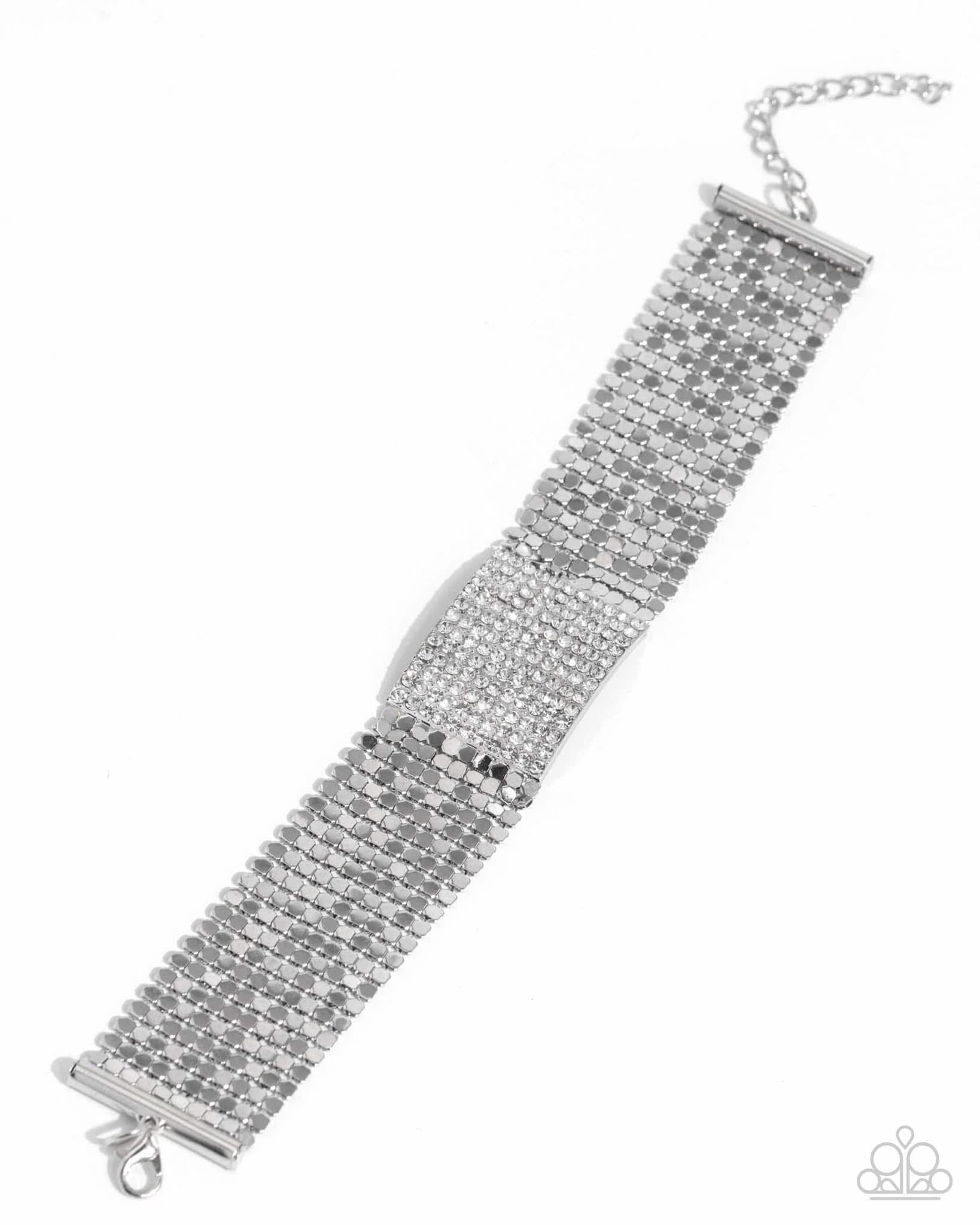 Elevate your style with this stunning piece, where delicate strands of silver sequins dance along the wrist, attached to sleek silver horizontal fittings. At its center, a brilliant white rhinestone-encrusted elongated square pendant shines bright, adding a touch of sophistication and glamour. Complete with an adjustable clasp closure for a secure fit.
