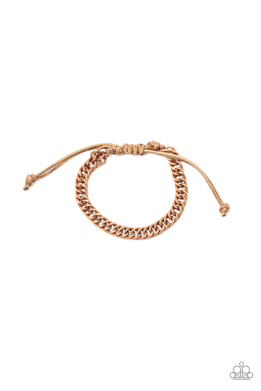 Shiny brown cording knots around the ends of a dainty copper curb chain that is wrapped across the top of the wrist for a versatile look. Features an adjustable sliding knot closure.