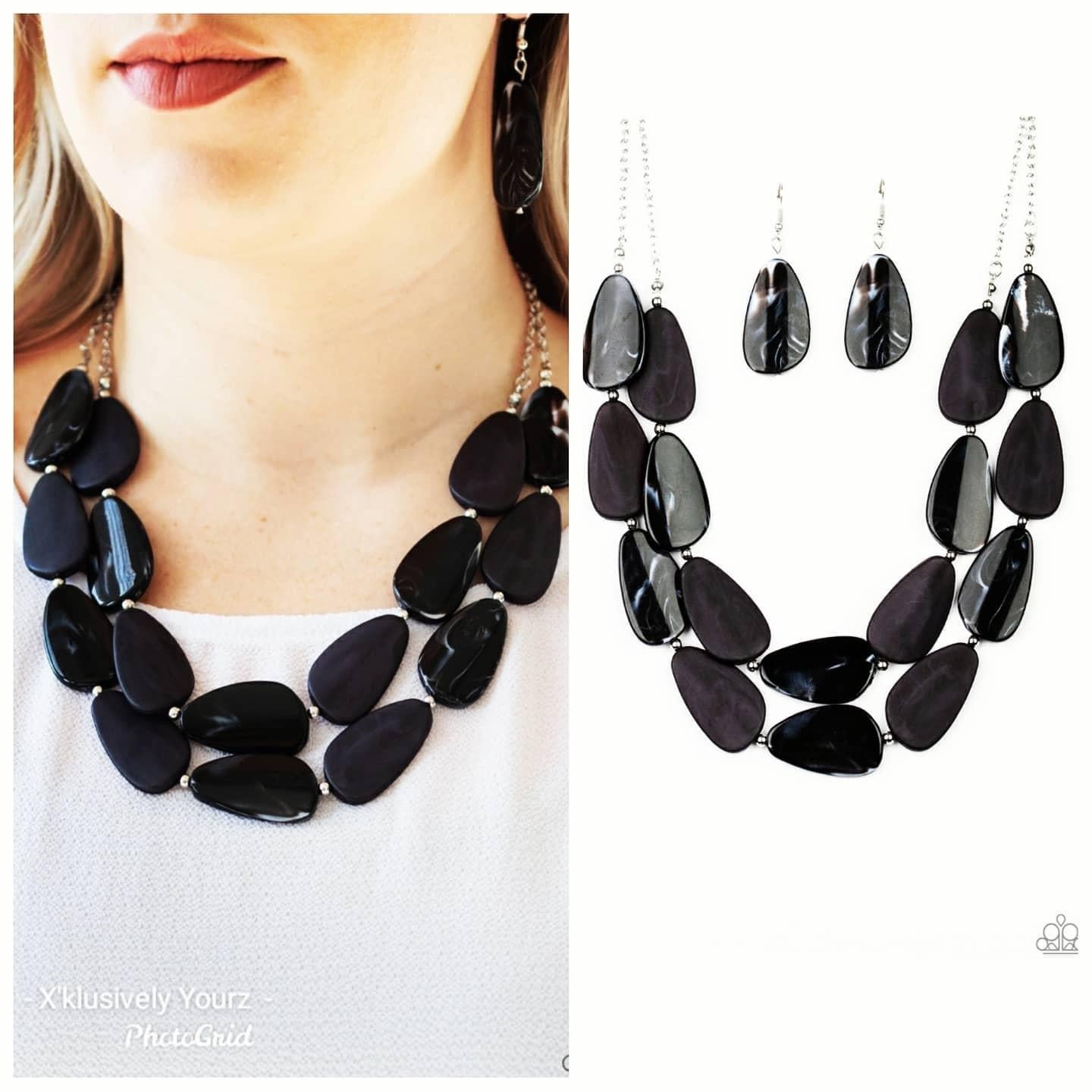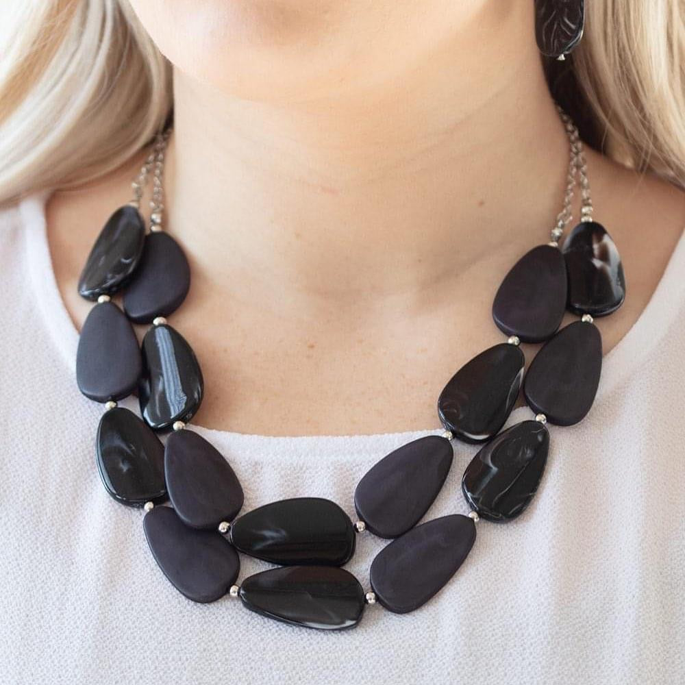 Featuring a faux marble finish, asymmetrical black teardrops and dainty silver beads are threaded along invisible wire, creating two serene layers below the collar. Features an adjustable clasp closure.