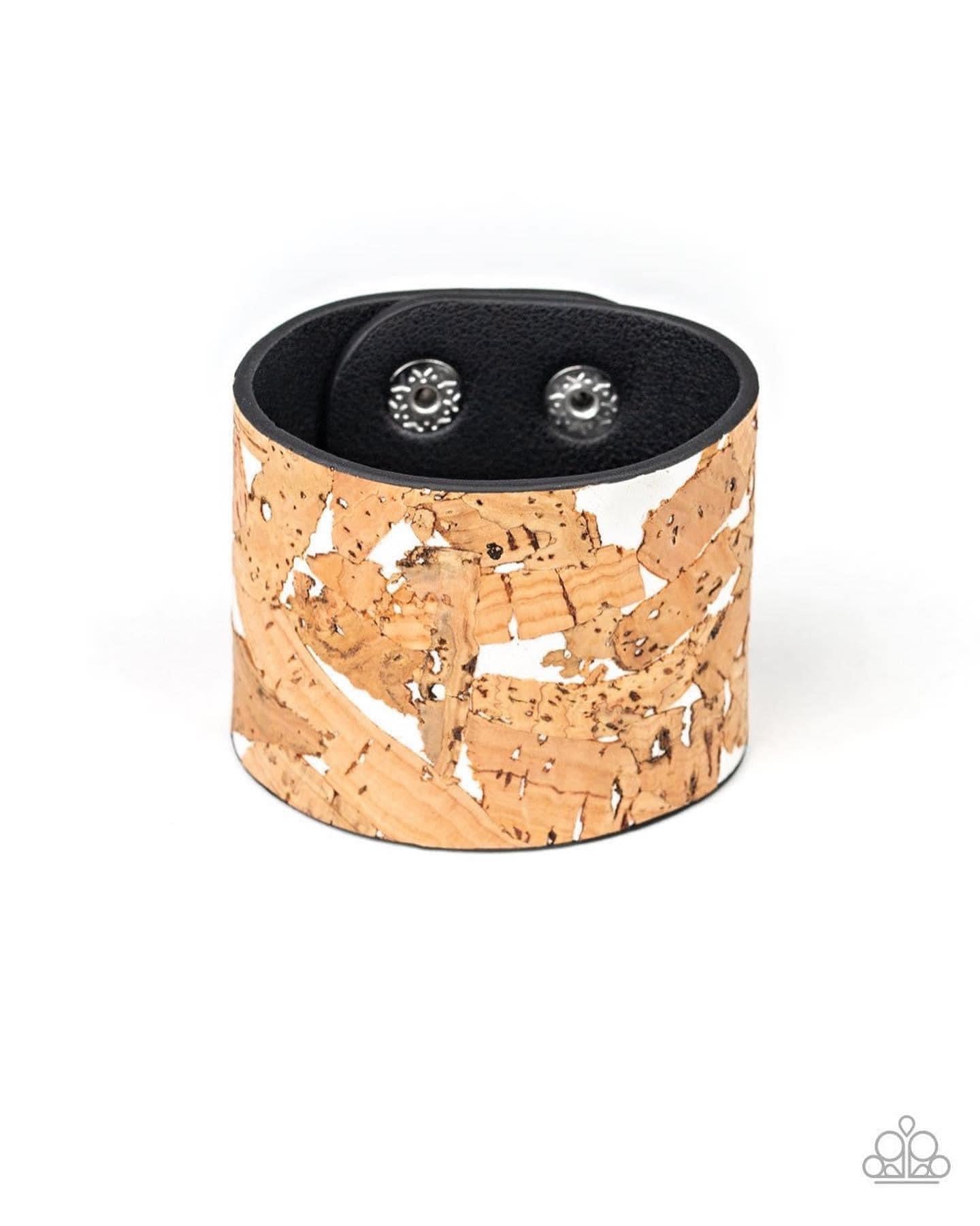 Pieces of cork have been plastered across the front of a shiny white leather band, creating an earthy look around the wrist. Features an adjustable snap closure.