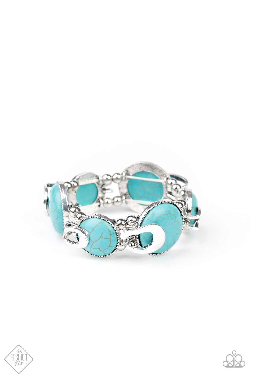 Infused with silver crescent-shaped fittings, oversized turquoise stone frames and shiny silver beads are threaded along a stretchy band around the wrist for a one-of-kind design.