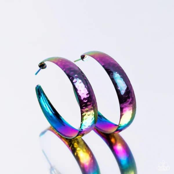 Radiating with hammered detail, an oil-spill finished hoop curls around the ear for a look ahead of its time. Earring attaches to a standard post fitting. Hoop measures approximately 1.75" in diameter.