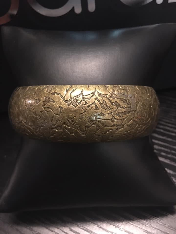 Brushed in an antiqued finish, a rosy floral pattern is embossed across a thick brass bangle for a seasonal flair.