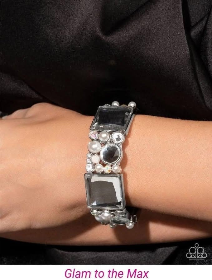 Infused along elastic stretchy bands, elevated faceted clear square gems alternate with clustered framed collections of varying sizes of white pearls, white, iridescent, clear, and opalescent gems for a glamorously glittery display. Due to its prismatic palette, color may vary.