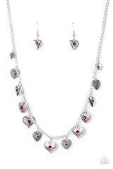 Dotted with fiery red rhinestone centers, a mismatched collection of silver heart frames swing from a dainty silver chain below the collar, creating a flirtatious fringe. Features an adjustable clasp closure.