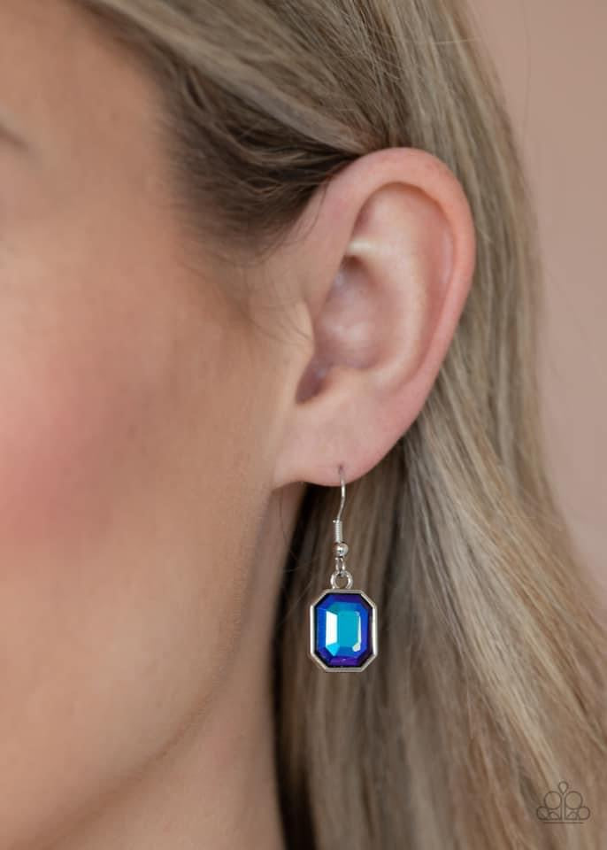 Featuring an out-of-this-world iridescence, emerald-cut blue gems delicately link below the collar. Attached to a dainty silver chain, the glittering row of rhinestones gives way to a dramatically oversized matching blue gem pendant for a statement-making finish.
