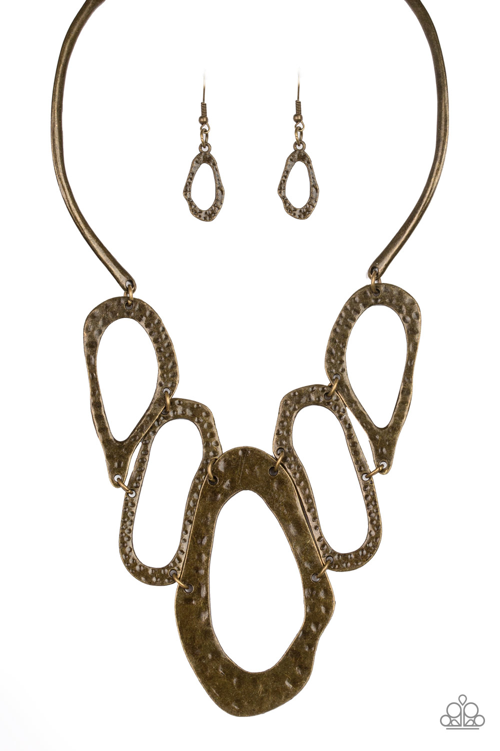 Attached to two bent brass bars, delicately hammered asymmetrical brass hoops link below the collar for an edgy statement making look. Features an adjustable clasp closure.
