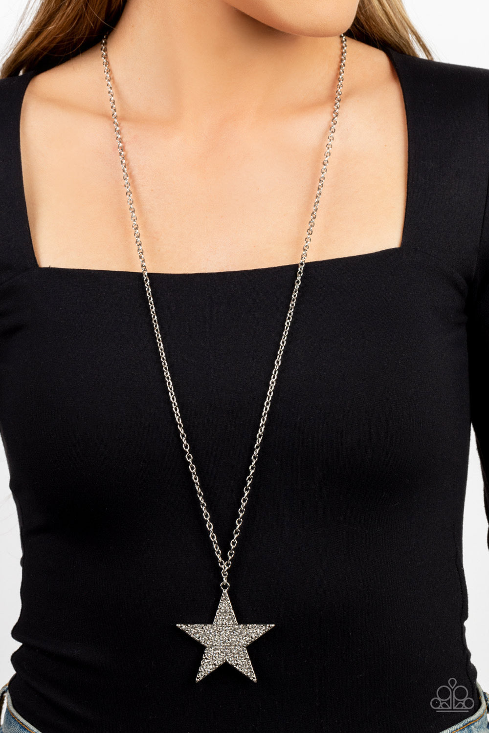 The front of an oversized silver star is encrusted in blinding white rhinestones, resulting in a stellar pendant at the bottom of a lengthened silver chain. Features an adjustable clasp closure.