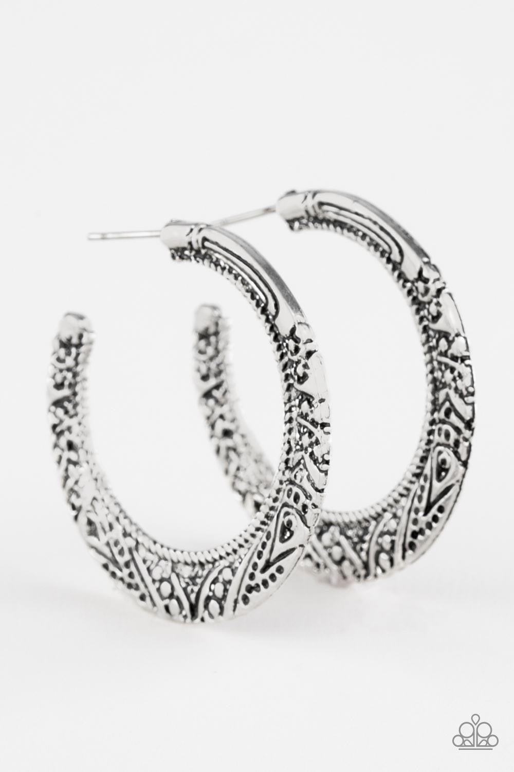 Stamped in tribal inspired patterns, a flattened silver bar curls around the ear for a seasonal look. Earring attaches to a standard post fitting. Hoop measures 1 1/2" in diameter.