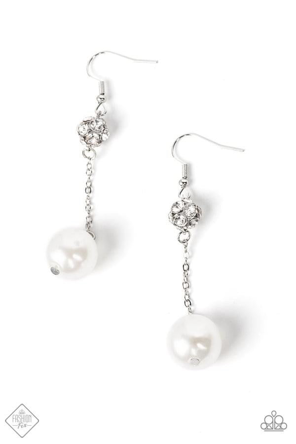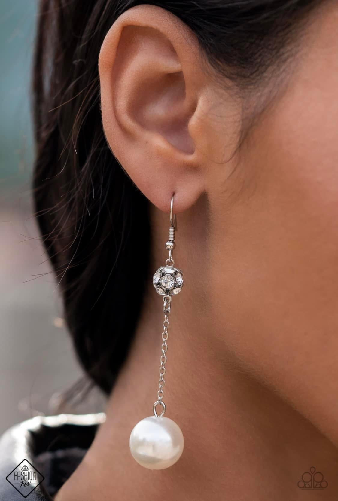 A lusciously oversized pearl is suspended from a dainty silver chain that delicately sways from a brilliant cluster of white rhinestones, making a glamorously elegant lure. Earring attaches to a standard fishhook fitting.