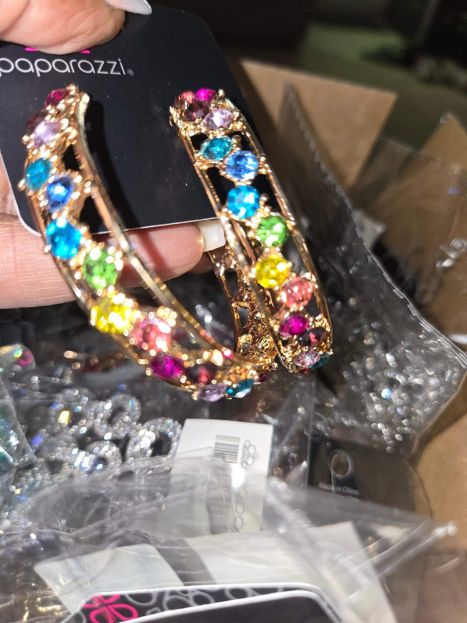 Encrusted along the front of an airy gold hoop, a collection of round multicolored gems sporadically dots around the ear for a shimmery statement. Earring attaches to a standard post fitting. Hoop measures approximately 2 1/2" in diameter.