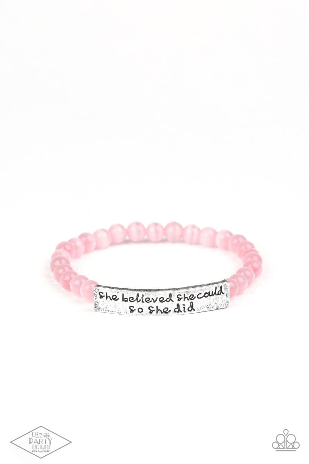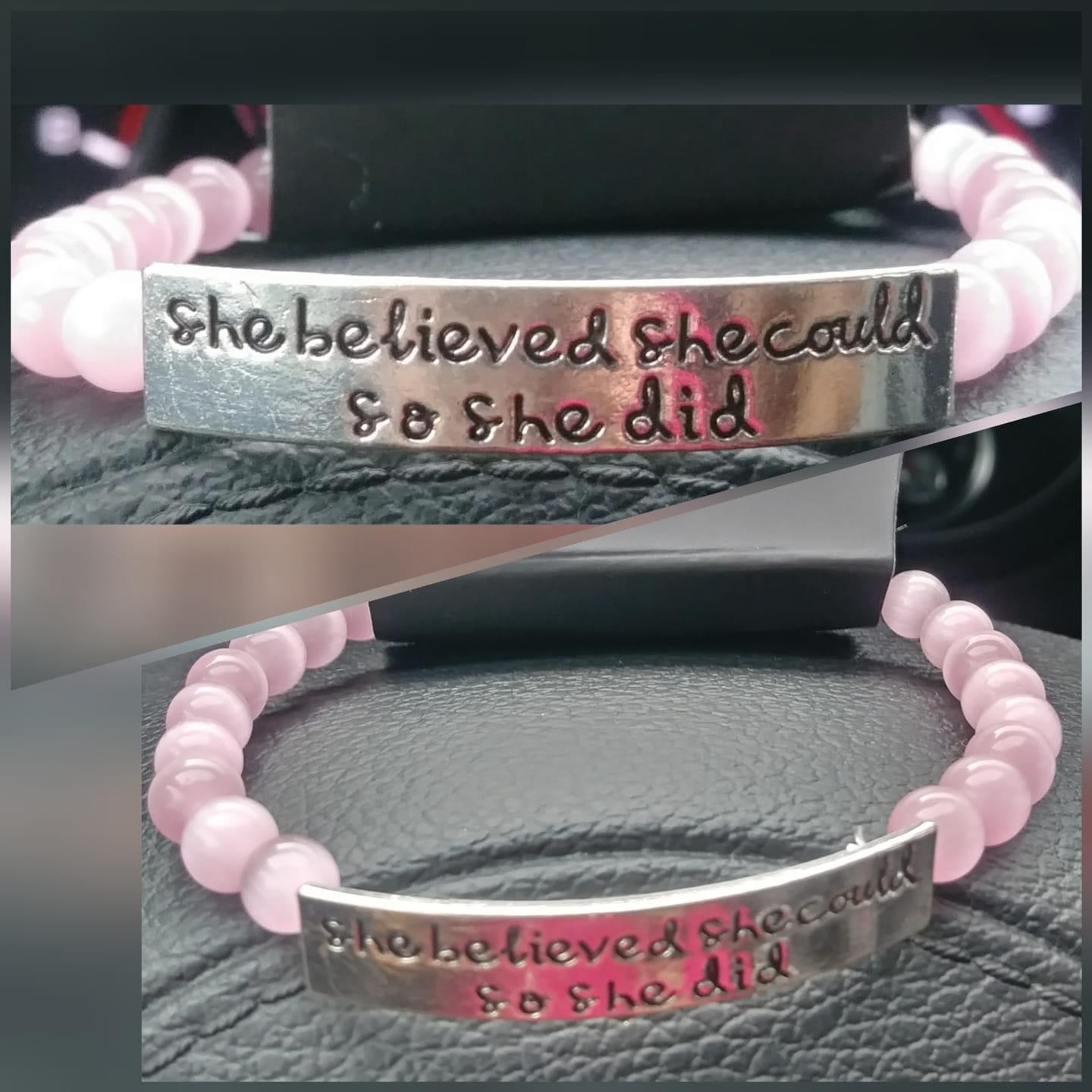 A collection of dainty pink cat’s eye stone beads and an antiqued frame stamped in the inspirational phrase, “She believed she could, so she did,” are threaded along a stretchy band around the wrist for a whimsical fashion.