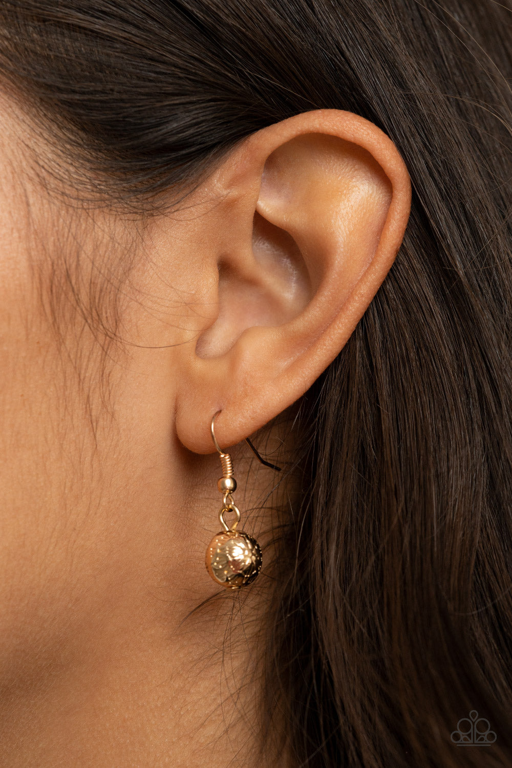 A dainty collection of ornate gold beads and white stone beads dot a dainty gold chain, giving way to a hammered gold ring featuring a shell-like center. A hammered gold disc and white shell-like disc swing from the bottom, creating a summery pendant. Features an adjustable clasp closure.